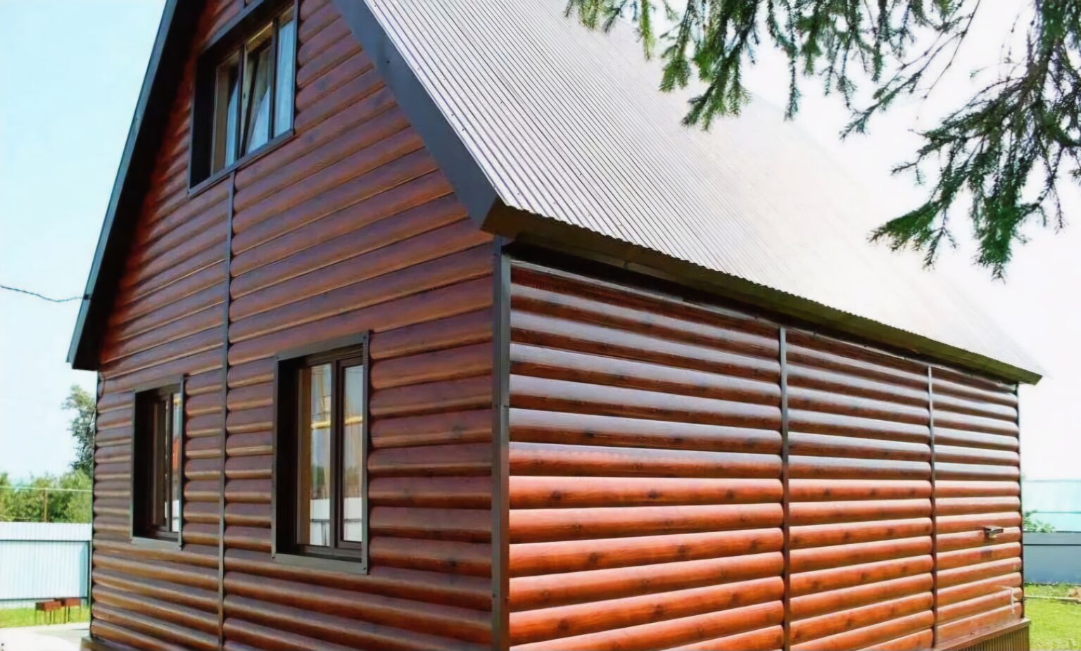 Использование металлического блок-хауса позволяет создать эффектный внешний вид здания, напоминающий оцилиндрованный брус, при этом сохраняя высокие эксплуатационные качества.